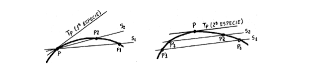 La recta tangente a una curva en un punto es el límite a que tiende la secante cuando los dos puntos de corte tienden a confundirse. De esta forma la tangente puede ser de primera especie cuando el punto de tangencia está quieto y el otro se aproxima al primero, de segunda especie cuando los dos puntos se aproximan simultáneamente hacia el de tangencia.